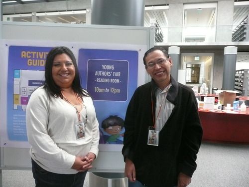 Guest Author Rene' Colato LaÃnez joins Past-President Charice Guerra in welcoming families to the Young Authors' Faire 2015.